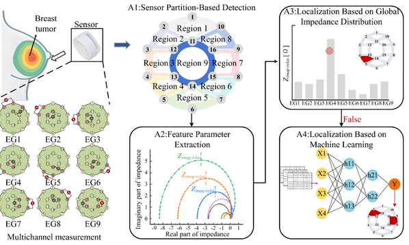 本文提出了一种多通道生物阻抗谱(MC-BIS)方法用于乳腺肿瘤的区域识别。首先,将传感器划分为九个子区域对乳房进行扫描,并应用空场校准算法对阻抗谱进行归一化处理。接着,通过数值模拟研究单发肿瘤的电学特性与其区域分布之间的关系。随后,评估了三种分类器——支持向量机(SVM)、随机森林(RF)和前馈神经网络(FNN)——在双发肿瘤定位中的性能。模拟结果表明,肿瘤区域与正常组织区域的阻抗特性存在显著差异(P < 0.001)。当肿瘤出现在某个子区域时,对应的虚部弛豫阻抗 Zimag-relax 超过 2.004 Ω。对于双发乳腺肿瘤定位,前馈神经网络(FNN)分类器表现最佳,通过五折交叉验证,其分类准确率为 95.46%。为了验证模拟结果,选取了具有不同电学特性的生物组织来模拟肿瘤组织和正常组织。实验准确率达到了 86.94%。多通道生物阻抗谱方法能够快速、准确地定位肿瘤区域,为乳腺癌的早期筛查和诊断提供了新的技术手段。