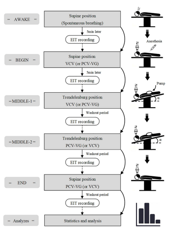 方法 :本试验是一项随机交叉研究,将腹腔镜围手术期分为五个阶段:麻醉诱导前(AWAKE)、麻醉诱导后(BEGIN)、手术第一阶段(MIDDLE-1)、手术第二阶段(MIDDLE-2)和苏醒前(END)。在每个阶段记录EIT数据,并计算EIT参数,以量化肺通气性能的空间和时间维度。