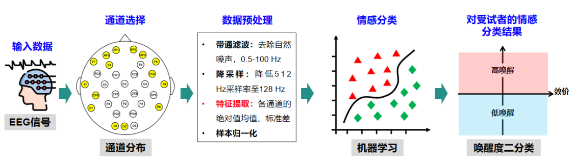 唤醒度作为人的重要情感,对脑疾病的检测和治疗帮助巨大。本研究提出在音乐视频诱发下,一种针对脑电(ElectroEncephaloGram, EEG)信号的唤醒度智能分类方法,以实现高唤醒度与低唤醒度区分。首先,使用DEAP(Dataset for Emotion Analysis using Physiological signals)公共数据集,选择与唤醒度紧密相关的15个电极通道。其次,分别进行带通滤波、降采样、特征提取、数据预处理与样本归一化等数据预处理。最后,利用两种经典机器学习分类器,即支持向量机(Support Vector Machine, SVM)与随机森林,实现唤醒度二分类。实验结果验证了提出的唤醒度分类方法的良好性能,将有助于孤独症、阿尔茨海默病等脑疾病的临床诊治与康复监测。