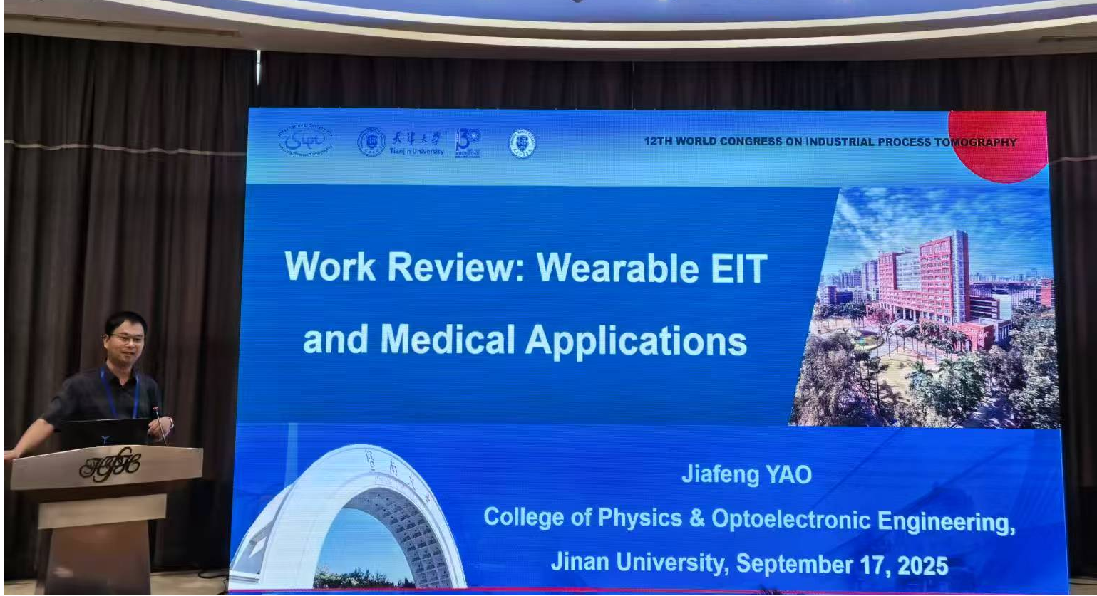 会议期间,研究室姚佳烽老师应邀作题为“Work Review: Wearable EIT and Medical Applications”的大会报告,系统回顾了可穿戴电阻抗断层成像(EIT)技术的发展历程,重点探讨了其在医疗监测与诊断中的前沿应用与未来趋势。报告围绕柔性电极设计、系统集成、动态成像算法等关键问题展开,展示了团队在可穿戴EIT传感与医工交叉融合方面的创新成果,引起了与会专家的广泛关注与深入交流。