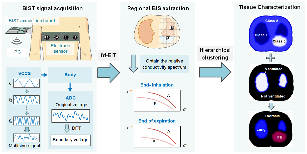 本文提出一种生物阻抗谱断层扫描(BIST)方法,用于快速实现胸腔积液(PE)的病因可视化。该方法利用生物组织的电导率谱定位并分析PE。通过多频差分电阻抗断层扫描获取区域电导率谱,随后采用层次聚类法对PE区域、肺部及其他组织进行分类,并根据时差分电阻抗断层扫描获得的通气区域对结果进行校正。此外,提取感兴趣区域的相对电导率谱,并绘制奈奎斯特曲线以表征电学特性用于病因分析。模型实验结果表明,BIST获得的PE区域相对电导率谱不受通气影响,在潮气呼吸期间波动极小(0.8%)。相对电导率谱与PE溶液浓度之间的肯德尔等级相关系数为0.965,证实了BIST对PE的诊断潜力。