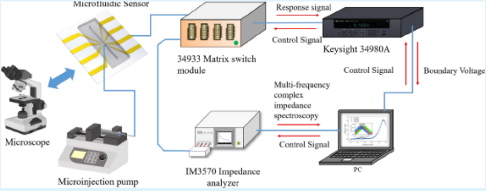 本研究提出了一种用于识别细菌抗生素耐药性的微尺度电化学阻抗谱断层扫描(EIST)方法。为此设计了一种8电极阵列微流控电阻抗传感器芯片。首先,通过数值模拟研究了电极对配置对传感器阻抗测量性能的影响,从而优化了传感器设计。其次,在实验中使用涂覆不同金属膜的聚苯乙烯(PS)微球模拟处于不同耐药阶段的细菌细胞。该方法通过数值模拟和实验数据验证,成功实现了直径20 µm 目标的定位。此外,能够有效识别出代表不同细菌抗生素耐药状态的涂覆不同金属膜的PS微球。结果表明,该方法在细菌抗生素耐药性快速实时诊断方面具有显著潜力。